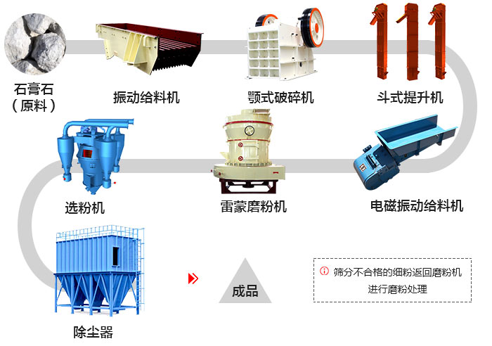大塊的石膏石原料在給料機(jī)的作用下,并均勻、連續(xù)的送入顎式破碎機(jī)進(jìn)行粗碎加工,破碎后的石膏石在斗式提升機(jī)的作用下被送入料倉,之后由電磁振動給料機(jī)均勻、定量的送到雷蒙磨粉機(jī)進(jìn)行磨粉加工,經(jīng)磨粉后的粉末在鼓風(fēng)機(jī)的租用下吹向分析機(jī)進(jìn)行分選,分選后的物料由廣島輸送到大旋風(fēng)收粉器,后經(jīng)出料口輸出。